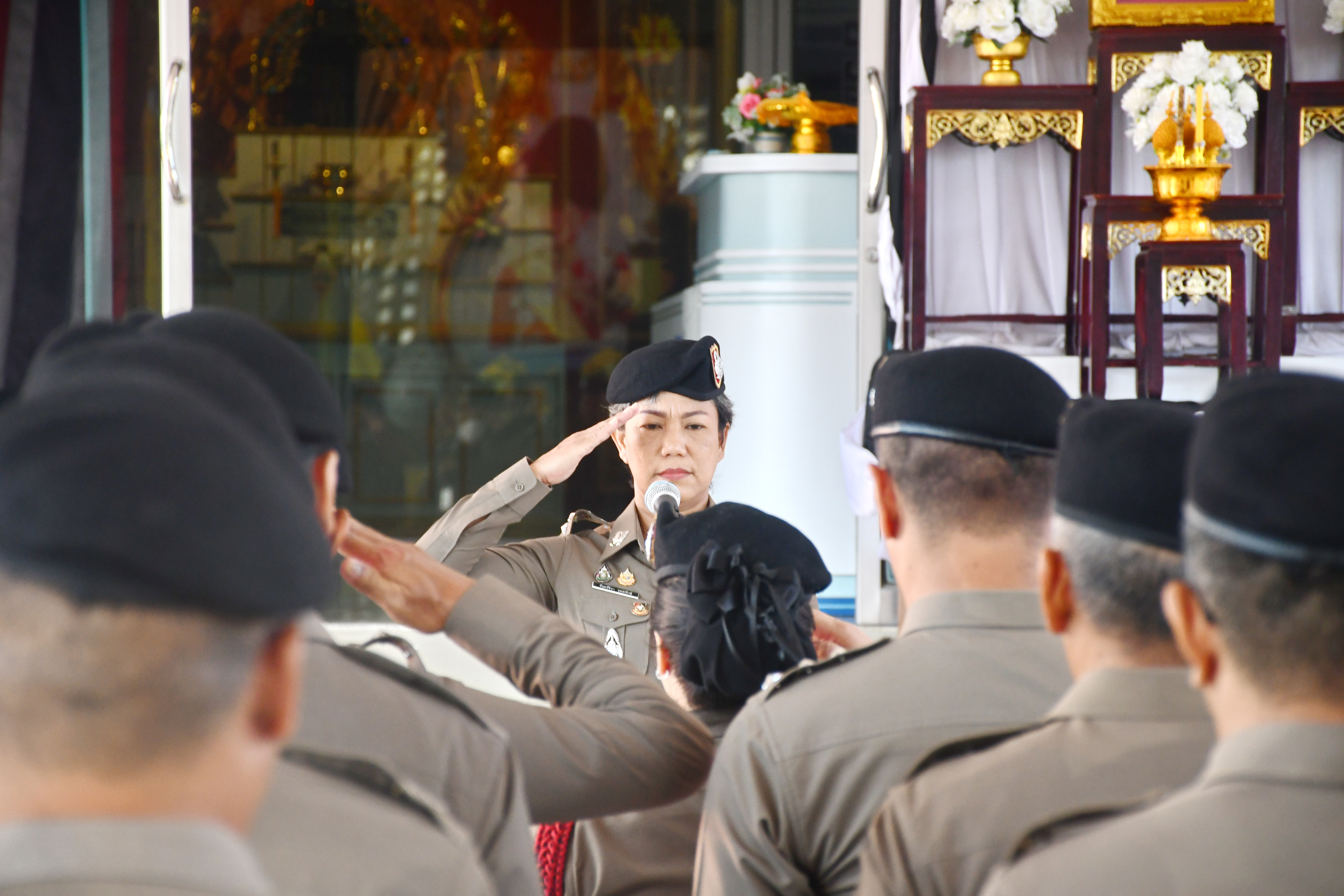 ตรวจเช็คยอดกำลังพล ตรวจเครื่องแต่งกายและทรงผม กล่าวคำสัตย์ปฏิญาณ เวรอำนวยการสรุปสถานการณ์ ชี้แจงข้อราชการ ณ หน้าอาคาร ศพฐ.10
