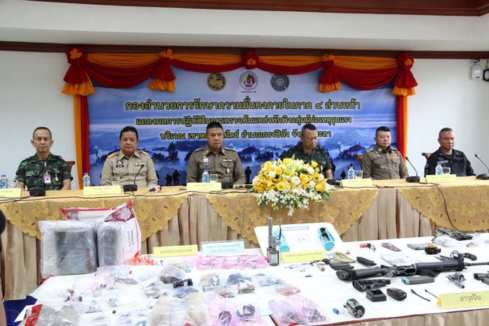 วันนี้ (16 ธ.ค.62) เวลา 10.00 น.พล.ต.ท.รณศิลป์ ภู่สาระ ผบช.ภ.9 / ผบ.ศปก.ตร.สน./ ผบ.กกล.ตร.จชต.พล.ต.ต.ปราบพาล มีมงคล ผบก.ภ.จว.ยะลา พล.ต.ต.ณฐพล สามเสน ผบก.ศพฐ.10, พ.ต.อ.ดำรงค์ ขำเปลี่ยน นวท.(สบ5)ศพฐ.10 พร้อมผู้บังคับบัญชาและเจ้าหน้าที่หน่วยราชการต่าง ๆ ร่วมแถลงข่าวการขยายผลการตรวจสอบ และตรวจค้นแหล่งพักพิงกลุ่มผู้ก่อเหตุรุนแรง บริเวณ เขาตะโล๊ะสโตร์ อ.กรงปินัง จว.ยะลา ณ ห้องรับประทานอาหารนายทหารสัญญาบัตร บก.กอ.รมน.ภาค 4 สน. อ.ยะรัง จว.ปัตตานี
