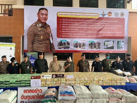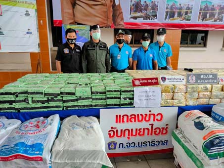 วันนี้(03/07/63) เวลา 13.45 น.พล.ต.อ.จักรทิพย์ ชัยจินดา ผบ.ตร.,พล.ต.อ.ชนสิษฎ์ วัฒนาวรางกูร จชต.,พล.ต.ท.รอย อิงคไพโรจน์ ผู้ช่วย ผบ.ตร.,พล.ต.ท.รณศิลป์ ภู่สาระ ผบช.ภ.9 /รอง ผอ.กอ.รมน.ภ.4 สน.,พล.ต.ท.ชินภัทร สารสิน ผบช.ปส.,พล.ต.ท.โชติ ชัยชมพู ผู้ทรงคุณวุฒิพิเศษ ตร. ช่วยราชการตำรวจภูธรภาค 9,พล.ต.ต.ดำรัส วิริยะกุล รอง ผบช.ภ.9,พล.ต.ต.ดุษฎี ชูสังกิจ รอง ผบช.ภ.9,พล.ต.ต.ปิยะวัฒน์ เฉลิมศรี รอง ผบช.ภ.9,พล.ต.ต.จิระวัฒน์ พยุงธรรม ผบก.ภ.จว.ปัตตานี ,พล.ต.ต.ปราบพาล มีมงคล ผบก.ภ.จว.ยะลา,พล.ต.ต.นรินทร์ บูสะมัญ ผบก.ภ.จว.นราธิวาส,นายเอกรัฐ หลีเส็น ผวจ.นราธิวาส, พ.ต.อ.สุรนาท วงศ์พรหมชัย นวท.(สบ4) กอส.ศพฐ.10/หน.ศบค.ศนต.จชต., พ.ต.อ.มานิตย์ ปานทอง นวท.(สบ 4) พฐ.จว.นราธิวาส ร่วมเเถลงข่าวผลการปฎิบัติการจับกุมผู้ต้องหายาเสพติดรายใหญ่ผู้ต้องหาจำนวน 2 คน พร้อมด้วยของกลางยาเสพติด(ยาไอซ์) จำนวน 1,425 กก. เเละผลการจับกุมผู้ต้องหายาเสพติดรายสำคัญในพื้นที่ จชต. ณ ลานหน้า ภ.จว.นราธิวาส อ.เมือง จว.นราธิวาส